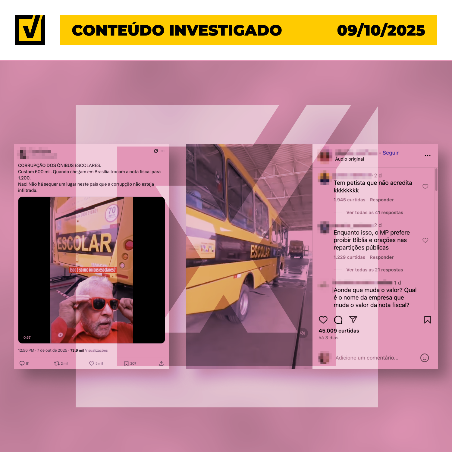 O conteúdo verificado mostra um homem filmando um ônibus com o logotipo do governo federal e a inscrição “Caminho da Escola”, enquanto afirma que os veículos teriam o preço aumentado irregularmente ao longo da entrega. Ele menciona que os ônibus sairiam da fábrica por R$ 600 mil e teriam a nota fiscal trocada para R$ 1,8 milhão, sugerindo desvio de recursos públicos.