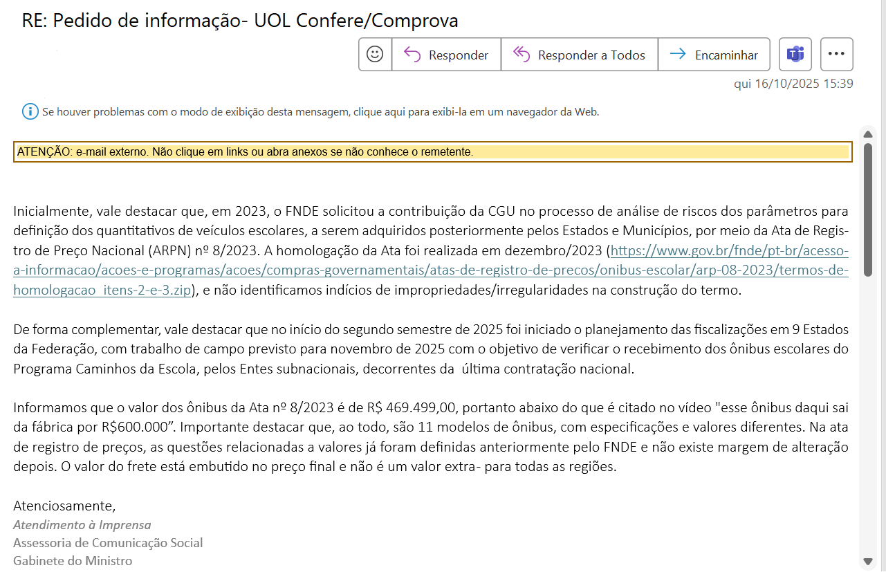 Para o Comprova, a Controladoria-Geral da União (CGU) informou que o FNDE solicitou, em 2023, uma análise sobre os riscos envolvidos na definição da quantidade de veículos a serem adquiridos pela Ata nº 8/2023. O documento foi homologado em dezembro de 2023, sem constatação de impropriedades ou irregularidades. A CGU também iniciou, no segundo semestre de 2025, o planejamento de fiscalizações em nove estados, com trabalho de campo previsto para novembro.