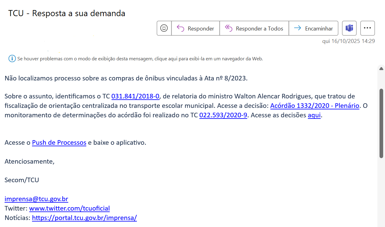 O Tribunal de Contas da União (TCU) afirmou que não há processos em andamento sobre o tema. O único processo relacionado a ônibus escolares foi aberto em 2018 e encerrado em 2020, sem relação com o caso atual.
