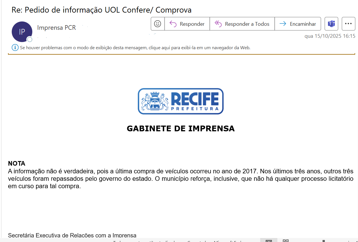 No vídeo, o autor diz que estaria saindo da fábrica da Mascarello, no Paraná, com destino a Recife. Em nota, a prefeitura de Recife disse que “a informação não é verdadeira, pois a última compra de veículos ocorreu no ano de 2017. Nos últimos três anos, outros três veículos foram repassados pelo governo do estado”. O município reforça, inclusive, que não há qualquer processo licitatório em curso para tal compra. O Comprova tentou contato com a empresa Mascarello e não obteve retorno.