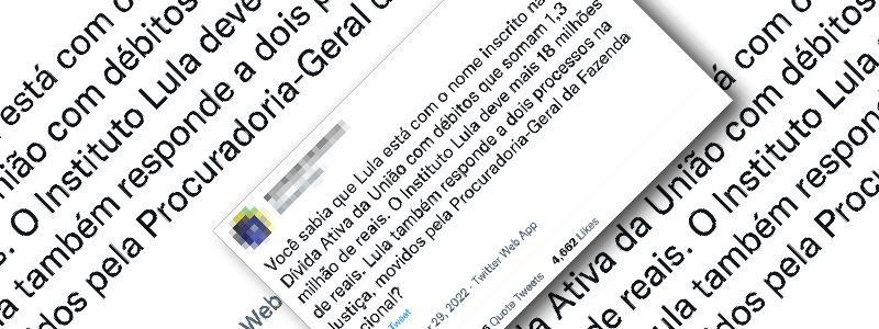 Onde foi publicado: Twitter Conclusão do Comprova: É verdadeira a informação de que o ex-presidente Luiz Inácio Lula da Silva (PT) tem o nome inscrito na dívida ativa da União por um débito de mais de R$ 1,3 milhão, como informa uma publicação feita no Twitter. Também está correta a informação de que o Instituto […]