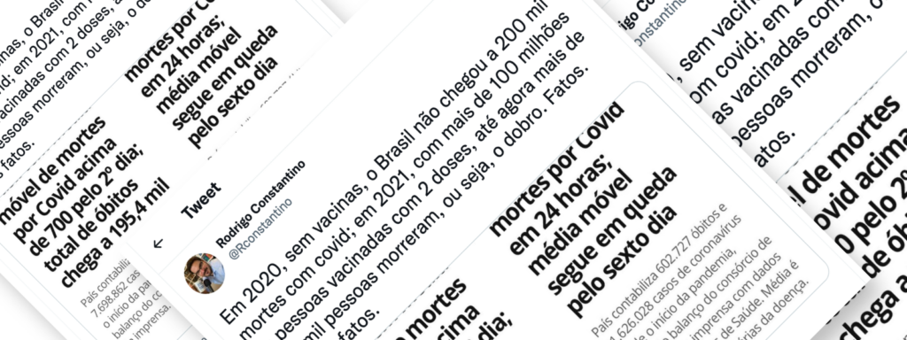 Conteúdo verificado: Publicação feita pelo economista e comentarista da Jovem Pan Rodrigo Constantino, no Twitter, distorce dados oficiais sobre a covid-19 apresentados pelo G1 para contestar a eficácia das vacinas. É enganosa a publicação compartilhada no Twitter pelo economista e comentarista da Jovem Pan Rodrigo Constantino contestando a eficácia das vacinas contra a covid-19, porque […]