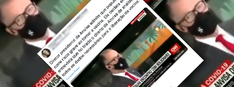 Conteúdo verificado: vídeo publicado no Twitter, em que o presidente da Anvisa (Agência Nacional de Vigilância Sanitária), Antônio Barra Torres, aparece dizendo que a vacina contra a covid-19 não é segura e que a população está correndo um “risco sanitário grave”. É falso o conteúdo de um post publicado no Twitter segundo o qual a […]