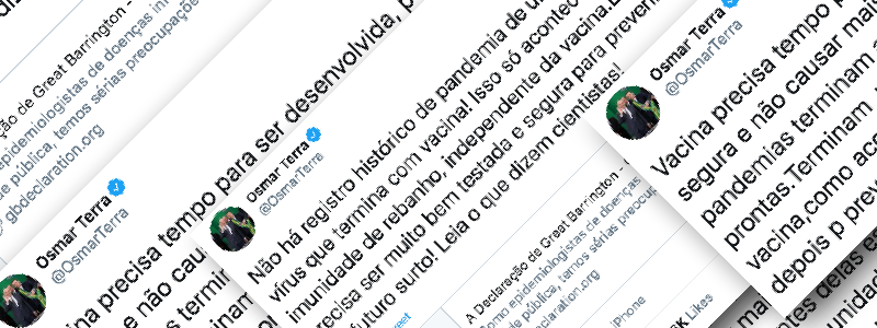 Conteúdo verificado: Dois tuítes semelhantes em que o deputado Osmar Terra afirma que pandemias acabam antes de as vacinas estarem disponíveis. São enganosos os tuítes do deputado federal Osmar Terra (MDB-RS) afirmando que as pandemias acabam por meio da disseminação da doença, não com vacinas. Ele declara, entre outros pontos, que “não há registro histórico […]