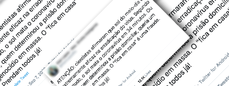 Conteúdo verificado: Tuíte afirma que, segundo cientistas, o sol do meio-dia é eficaz na erradicação do SARS-CoV-2 e mata o vírus em 34 minutos. É enganosa uma postagem no Twitter que aponta possíveis benefícios da exposição ao sol contra a covid-19. De autoria do perfil @AlanLopesRio, a postagem diz que cientistas teriam afirmado que permanecer […]