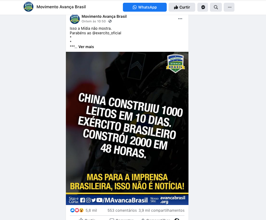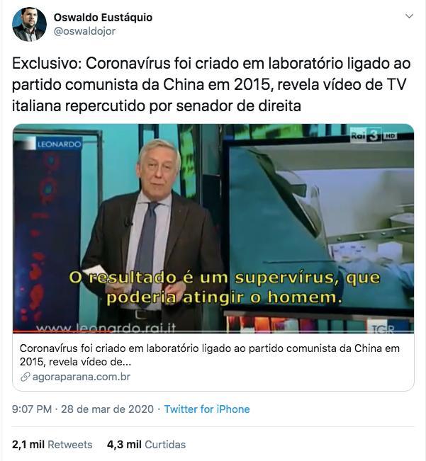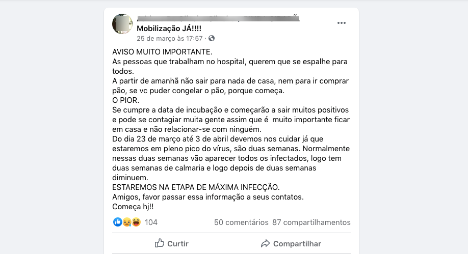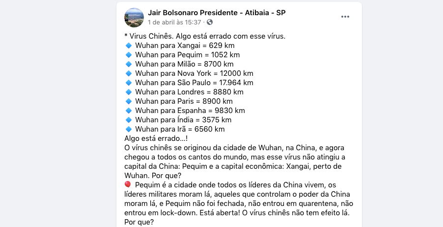 Uma corrente que circula nas redes sociais afirmando que o novo coronavírus não chegou às grandes cidades chinesas, apresenta uma série de dados falsos para tentar comprovar que o vírus é um “atentado terrorista” produzido pela China para “criar pânico no mundo”. O conteúdo foi publicado originalmente na página do Facebook “Jair Bolsonaro Presidente – […]