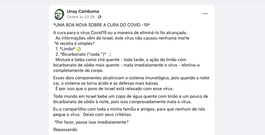 É falso que a mistura de limão com bicarbonato de sódio cure a covid-19, ao contrário do que afirma uma corrente que circula no WhatsApp e nas redes sociais. De acordo com a Organização Mundial de Saúde (OMS) e o Ministério da Saúde, ainda não existem tratamentos ou remédios específicos comprovadamente capazes de curar pacientes […]