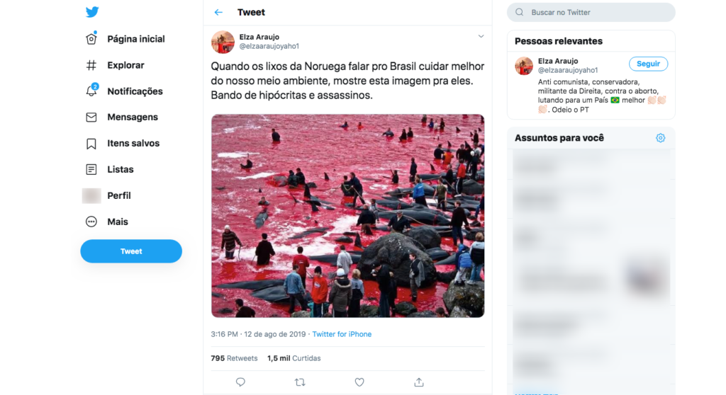 Está fora de contexto a fotografia que circula nas redes sociais sobre suposta matança de baleias promovida pela Noruega. Segundo publicações localizadas pelo Comprova no Instagram e no Twitter, o país nórdico é “hipócrita” por se preocupar com o meio ambiente no Brasil enquanto promove a caça dos animais. A foto em questão, na verdade, […]