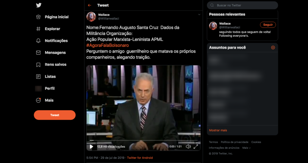 Um trecho da entrevista para o programa Dossiê Globo News com o ex-guerrilheiro da Ação Libertadora Nacional (ALN) Carlos Eugênio Paz foi utilizado em um post enganoso no Twitter como sendo uma confissão do assassinato de Fernando Augusto de Santa Cruz Oliveira. Fernando desapareceu durante o regime militar e era pai do atual presidente da […]