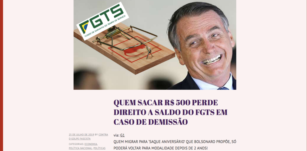 Não é verdade que quem sacar R$ 500 do Fundo de Garantia por Tempo de Serviço (FGTS) perde o direito ao restante do saldo em caso de demissão. Um artigo com título falso que viralizou no Facebook confunde as duas modalidades de saque do fundo que foram anunciadas pelo governo no dia 24 de julho. […]