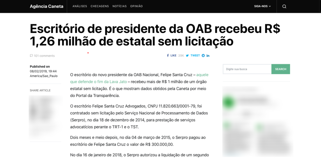 É enganoso um artigo compartilhado nas redes sociais sobre os contratos do escritório do presidente da Ordem dos Advogados do Brasil (OAB), Felipe Santa Cruz, com a Petrobras e o Serviço Federal de Processamento de Dados (Serpro) durante a gestão da ex-presidente Dilma Rousseff (PT). O texto omite o fato de que os tipos de […]