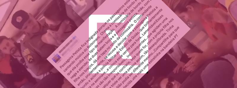 Conteúdo investigado: Post em vídeo mostra confusão dentro de aeronave e policiais militares retirando uma criança e uma mulher que estavam sentadas. A legenda diz que “passageira petista teria ficado indignada porque os passageiros estavam cantando música do Bolsonaro” e discutido e batido em aeromoça que teria se negado a pedir para as pessoas pararem […]