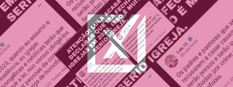 Conteúdo investigado: Imagem com o seguinte texto em destaque: “Atenção! Lula acaba de declarar que irá fechar igrejas em 2023, isso é muito sério igreja.” O alerta é acompanhado de dois supostos tuítes do presidenciável sobre o tema. Em um deles, Lula estaria afirmando que “padres e pastores que se recusarem a casar casais LGBTs […]