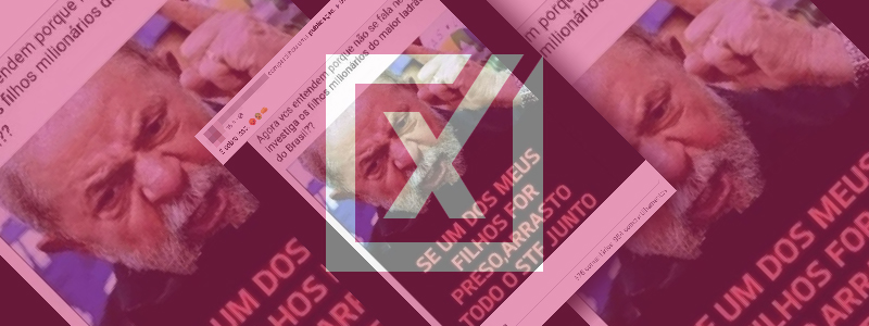 Conteúdo investigado: Post no Facebook traz uma imagem do ex-presidente Lula com um texto afirmando que os “filhos milionários” do petista não são investigados pela Justiça porque Lula teria ameaçado o Supremo Tribunal Federal. Embaixo da foto, há uma frase atribuída ao ex-presidente: “Se um dos meus filhos for preso, arrasto todo o STF junto”. […]