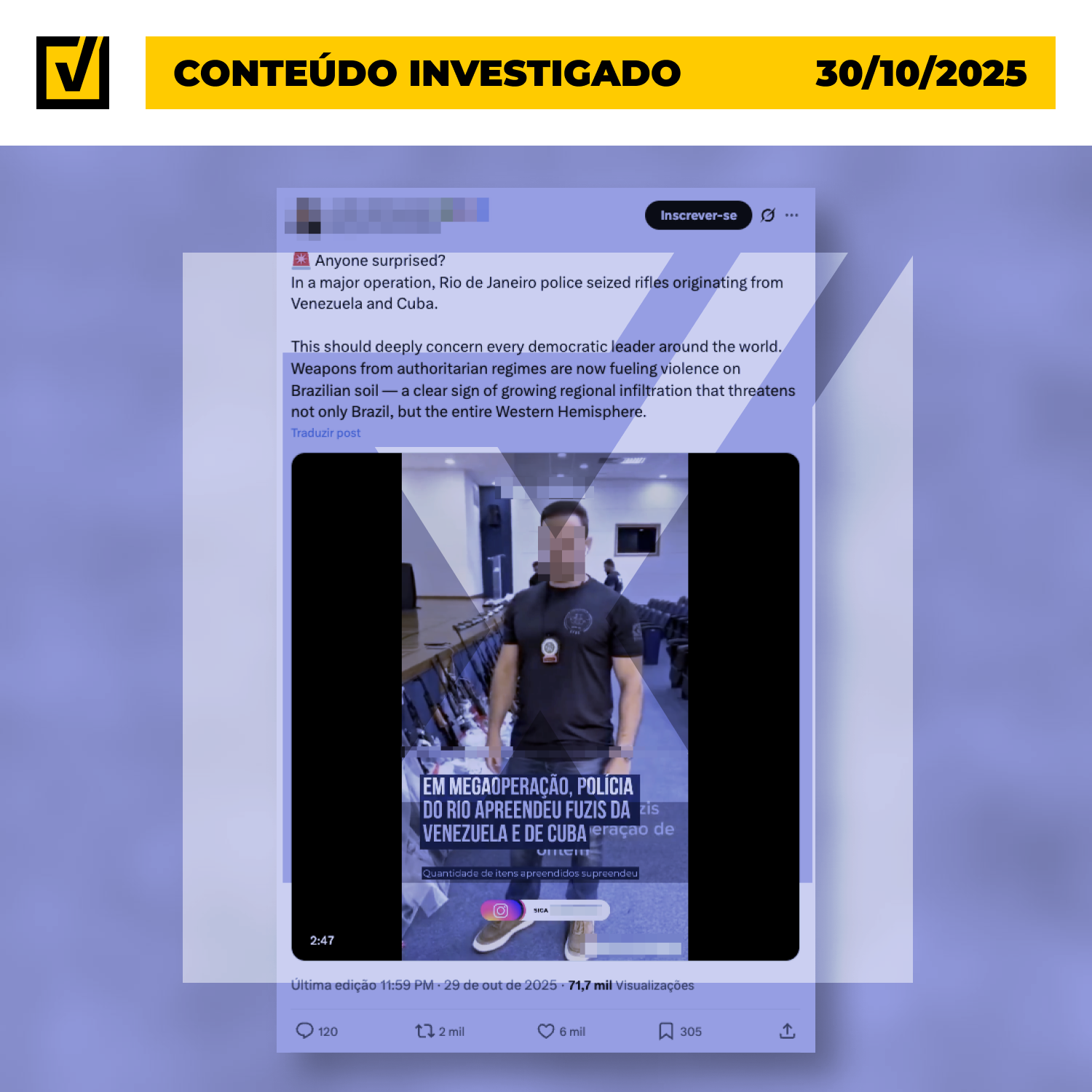 Conteúdo analisado: Posts nas redes sociais usam o vídeo de um delegado da Polícia Civil do Rio, no qual ele detalha os armamentos apreendidos na operação realizada em 28 de outubro nos complexos da Penha e do Alemão. Sobre o vídeo, há um texto segundo o qual fuzis de Cuba e da Venezuela teriam sido encontrados entre as apreensões.