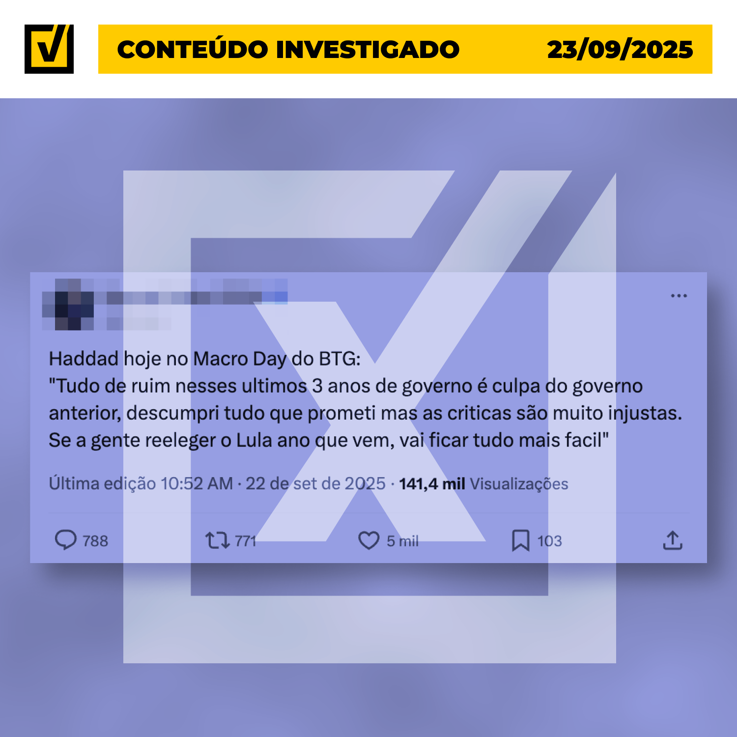 A postagem analisada pelo Comprova mistura a frase falsa com uma declaração que Haddad realmente fez. Questionado por Mansueto Almeida, sócio e economista-chefe do BTG, se “independentemente da eleição é para a gente ficar otimista com o Brasil”, o ministro respondeu: “Se a gente reeleger o Lula ano que vem, vai ficar tudo mais fácil”.