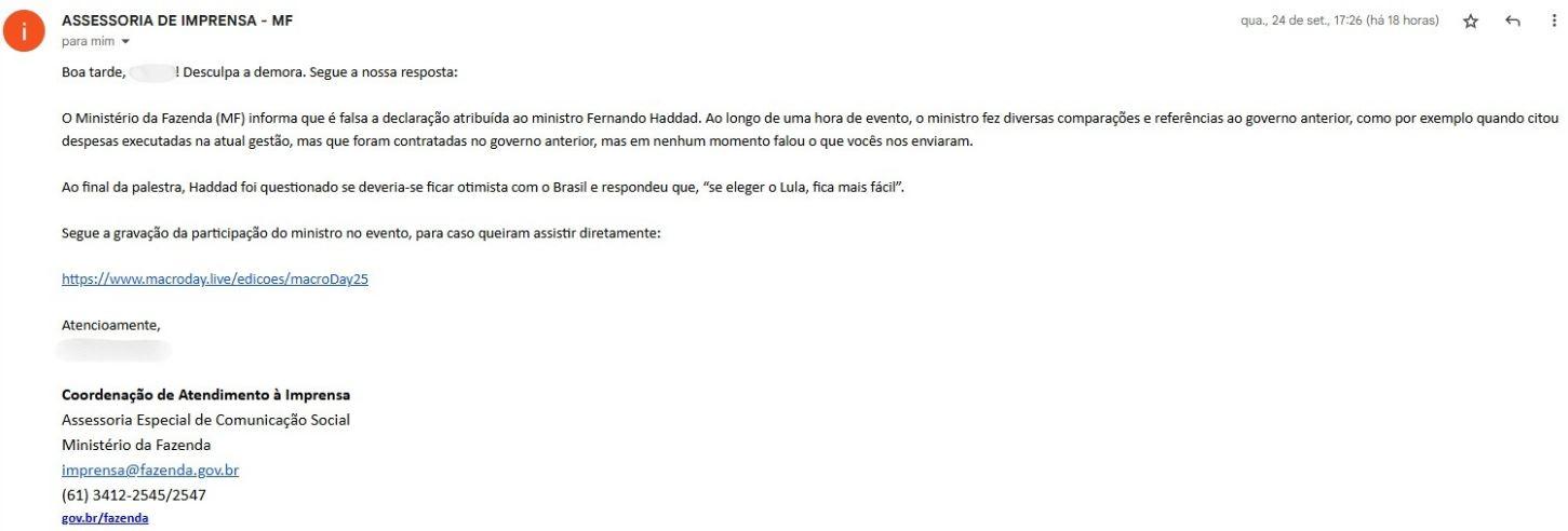 Ao Comprova, o Ministério da Fazenda afirmou que os posts são falsos. “Ao longo de uma hora de evento, o ministro fez diversas comparações e referências ao governo anterior, como por exemplo quando citou despesas executadas na atual gestão, mas que foram contratadas no governo anterior, mas em nenhum momento afirmou a frase”, comunicou.